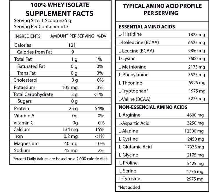 Each serving of our delicious blend contains 26 grams of fast-absorbing, whey protein isolates which provide your body with practically zero carbs, fats, and lactose while promoting lean muscle growth and loss of body fat and helps improve recovery time from intense training.